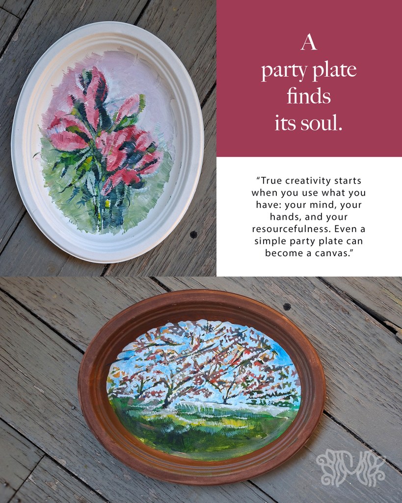 “True creativity starts when you use what you have: your mind, your hands, and your resourcefulness. Even a simple party plate can become a canvas.”